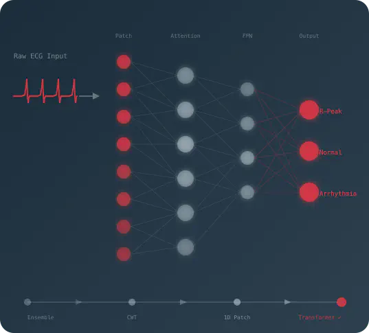 Our research has progressed through multiple generations of detection algorithms β from ensemble voting systems to continuous wavelet transforms β culminating in a proprietary 1D Patch Transformer model. In validation tests, our AI model is meeting or exceeding the accuracy of expert human analysis. This breakthrough validates our core thesis: AI trained on the hardest cardiac signals can generalize to simpler ones.